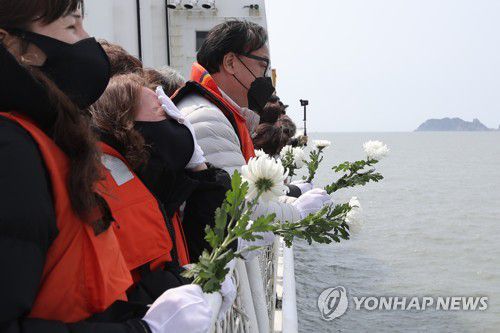 곧이어 헌화하는 순간 여기저기서 울음소리가 터져 나오기 시작했다. 유족들은 경비함 갑판 난간에 붙어 국화꽃 한 송이를 쉽사리 던져버리지 못하고 꼭 쥐고 있다가 끝내 던지고선 꽃잎이 파도에 흐트러지는 모습을 지켜봤다.