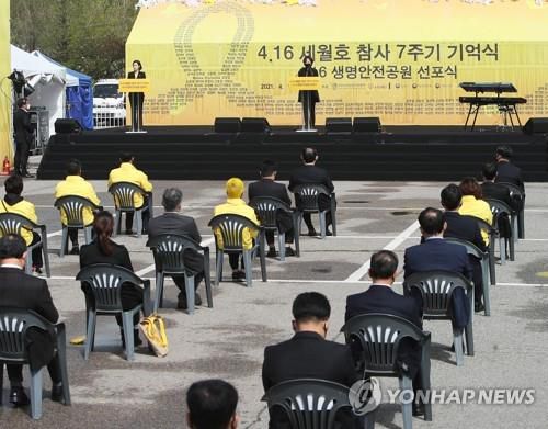 이어 추도사에 나선 유은혜 부총리 겸 교육부 장관은 "7년이 지났지만 세월호 참사의 진실은 완전히 밝혀지지 않았다"며 "국가 차원의 온전한 진실 규명이 필요하고, 문재인 정부는 진실이 규명되도록 끝까지 노력하겠다"고 약속했다.
