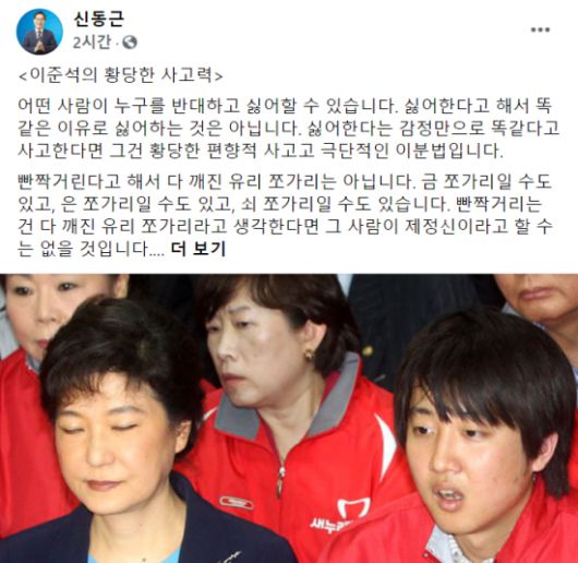 신 의원은 "이준석 전 최고위원의 머리로는 문재인 대통령과 헌법 위반으로 탄핵을 당한 박근혜 전 대통령의 커다란 차이가 분별 되지 않나 보나"라며 "황당한 사고는 허무맹랑한 분별력으로 이어진다. 초등학생의 지능으로도 쉽게 분별할 수 있는 것이 이 전 최고위원에게는 그러지 못한다는 생각을 하니 측은하기까지 하다"고 비난했다.