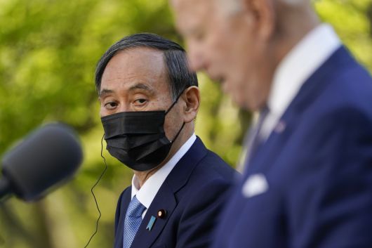 스가 요시히데 일본 총리가 16일(현지시간) 백악관 로즈가든에서 열린 공동 기자회견에서 조 바이든 미국 대통령의 발언을 듣고 있다. 워싱턴D.C./AP연합뉴스 |