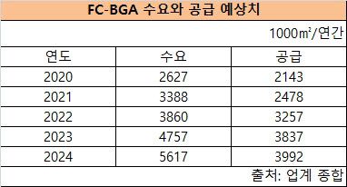 이 같은 공급 부족 사태는 적어도 내년 상반기까지 이어질 것으로 전망된다. 대규모 장비 증설이 없다면 이 상황이 수년 동안 지속될 것이라는 예상도 나왔다. 일각에선 2024년 FC-BGA 수요가 공급자의 생산 능력보다 40%나 더 많다는 전망도 심각성을 더하고 있다.