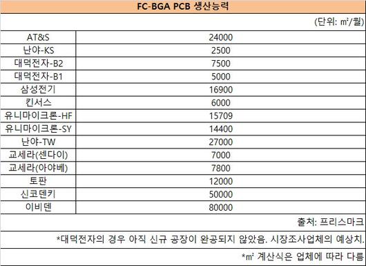 국내에서는 최근 관련 투자가 활발해지고 있다. 그동안 삼성전기가 유일한 FC-BGA 기판 공급 업체였지만 최근 대덕전자가 1600억원을 투자하며 생산 라인을 갖춰 가고 있다. 지난해 9월부터 FC-BGA를 월 2000㎡ 생산하고 있는 대덕전자는 내년 초까지 5000㎡ 규모의 생산 능력을 갖춰 수요에 대응한다는 계획이다.