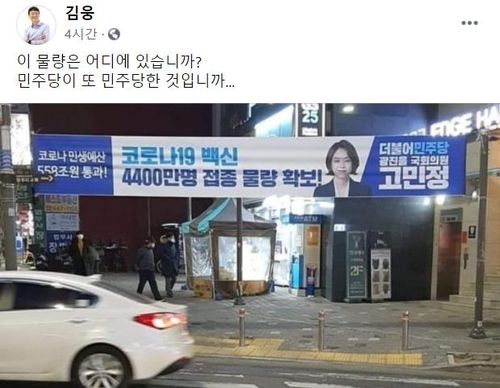김웅 의원은 더불어민주당 고민정 의원이 과거 자신의 지역구인 서울 광진을에 '코로나19 백신 4천400만명 접종 물량 확보!'라며 내건 현수막을 SNS에 공유했다.