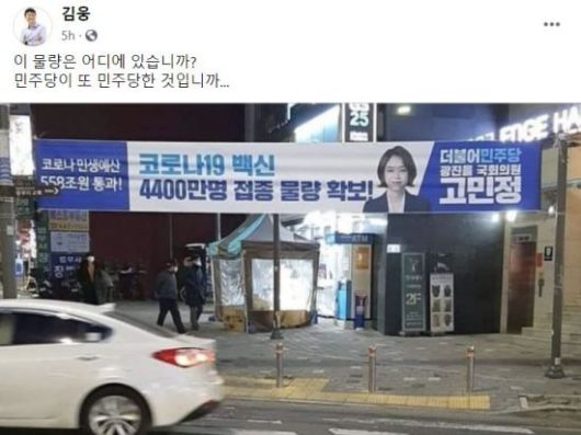 김웅 국민의힘 의원은 페이스북에서 고민정 더불어민주당 의원이 과거 서울 광진을에 내걸었던 '코로나19 백신 4400만명 접종 물량 확보!'라고 적힌 현수막을 공유했다. 김 의원은 "이 물량은 어디에 있나"라며 "민주당이 또 민주당한 것인가"라고 지적했다.
