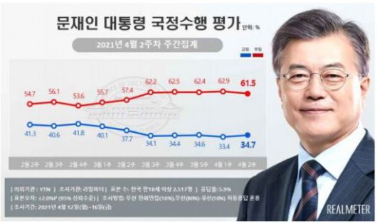 리얼미터는 YTN 의뢰로 지난 12~16일 여론조사를 벌인 결과 문 대통령의 국정 수행 지지율(긍정평가)이 전주 주간집계 대비 1.3%포인트 오른 34.7%로 집계됐다고 19일 밝혔다. 부정평가도 전주 대비 1.4%포인트 내려 61.5%를 기록했다. '모름·무응답'은 0.1%포인트 증가한 3.8%였다.