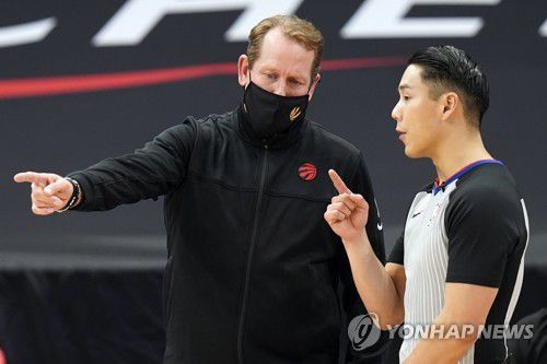 토론토 너스 감독과 대화하는 한국계 스콧 심판(오른쪽). |