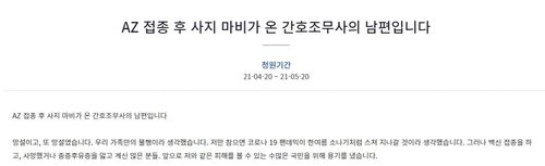 (서울=연합뉴스) 임형섭 기자 = 아스트라제네카(AZ) 백신을 접종했다가 사지마비 등의 부작용을 보여 입원한 간호조무사의 배우자가 억울함을 호소하는 국민청원이 20일 청와대 게시판에 올라왔다.