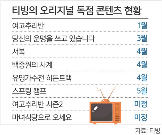 티빙의 시청자 급증은 다양한 오리지널 콘텐츠 확보 전략이 통했다는 분석이 나온다. 티빙은 지난 1월 대탈출로 유명한 정종연 PD의 ‘여고추리반’을 시작으로 ‘도깨비’의 김은숙 작가가 참여한 드라마 ‘당신의 운명을 쓰고 있습니다’, 배우 공유와 박보검의 만남으로 화제가 된 영화 ‘서복’ 등 다양한 장르의 오리지널 콘텐츠를 순차적으로 공개했다. 티빙은 이미 공개된 콘텐츠에 ‘여고추리반’ 시즌2 등 20여편의 오리지널 콘텐츠를 올해 내놓겠다는 전략이다.