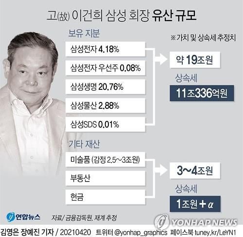이 부회장 등 유가족이 물려받을 상속 재산은 주식과 미술품 등을 합쳐 총 30조원이 넘을 것으로 추정된다. 가장 막대한 재산은 삼성 계열사 주식이다. 삼성전자(4.18%)와 삼성생명(20.76%), 삼성물산(2.88%), 삼성SDS(0.01%) 등 삼성 계열사 주식의 시장 가치가 24조원대로 예상된다.