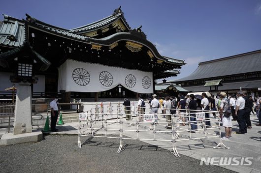 [도쿄=AP/뉴시스]태평양전쟁 패전 75주년을 맞은 15일 일본 도쿄의 야스쿠니 신사를 찾은 참배객들이 참배 순서를 기다리고 있다. 아베 신조 일본 총리는 야스쿠니 신사에 참배하진 않았으나 공물을 바친 것으로 알려졌다. 2020.08.15. |