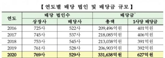 거래소에 따르면 2020년 결산 현금배당을 실시한 유가증권시장 법인은 총 769곳 중 529개사, 배당금총액(우선주 포함)은 33조2000억원을 기록했다. 1사당 평균 배당금은 627억원으로 최근 5년 내 최고치를 기록했다.