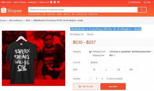 21일 온라인 쇼핑 플랫폼 '쇼피' 홈페이지에서 'Everything will be OK(다 잘 될 거야)'를 검색하면 해당 문구가 들어간 티셔츠를 판매하는 코너가 여러 개 뜬다.