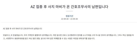 앞서 해당 간호조무사의 배우자는 지난 20일 청와대 국민청원 게시판에 글을 올려 “아내는 우선접종 대상자라 백신 접종을 거부할 수도, 백신을 선택할 권리도 없었다”며 “국가를 믿고 접종했는데 돌아온 것은 큰 형벌 뿐이다. 부작용을 정부가 책임진다는 대통령님의 말씀을 믿었는데, 연인에게 배신당한 기분”이라며 억울함을 호소했다.