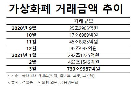 반대로 가상화폐 시장 거래대금 규모는 올해 들어 큰 폭으로 늘었다. 성일종 국민의힘 의원이 금융위에서 받은 자료에 따르면 국내 4대 암호화폐 거래소 합산 월별 거래금액은 △1월 292조1236억원 △2월 463조1547억원 △3월 730조9987억원이다.