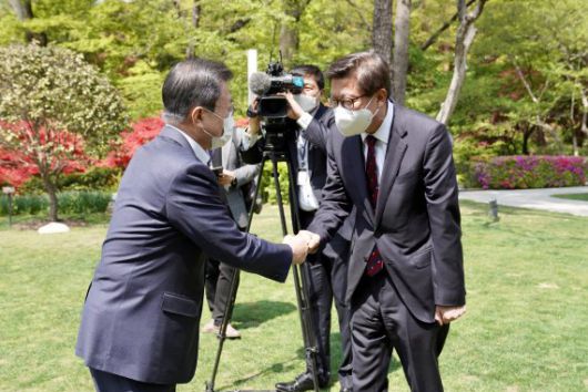 문재인 대통령이 21일 청와대 상춘재에서 열린 오찬 간담회에 참석하며 박형준 부산시장과 인사를 하고 있다. /사진=뉴시스 |