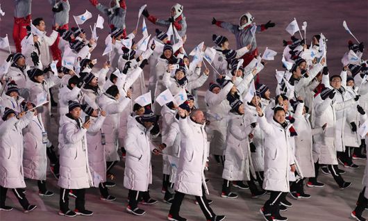 지난 2018년 2월 9일 강원도 평창 올림픽스타디움에서 열린 2018 평창동계올림픽 개막식에서 남북 선수단 공동기수인 남측 원윤종, 북측 황충금이 한반도기를 앞세우고 동시 입장하고 있다. 연합뉴스 |