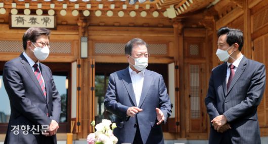 식전 환담 문재인 대통령이 21일 청와대 상춘재에서 지난 4·7 보궐선거에서 당선된 오세훈 서울시장(오른쪽), 박형준 부산시장과 오찬간담회를 시작하기 전 환담을 나누고 있다. 강윤중 기자 |
