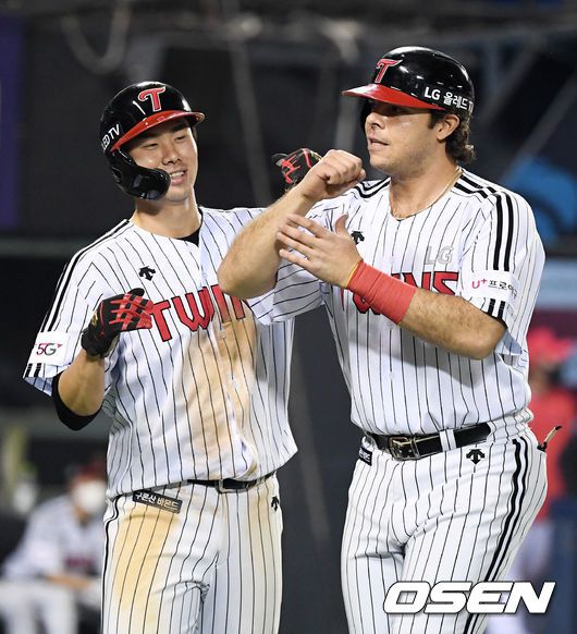[OSEN=잠실, 지형준 기자] 21일 오후 서울 잠실야구장에서 ‘2021 신한은행 SOL KBO리그’ LG 트윈스와 KIA 타이거즈의 경기가 열렸다. 7회말 2사 1,2루에서 LG 라모스가 스리런포를 날리고 홍창기와 기뻐하고 있다. /jpnews@osen.co.kr