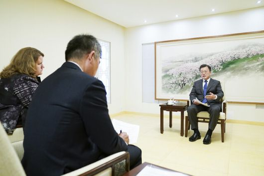 문재인 대통령이 지난 19일 청와대 상춘재에서 <뉴욕 타임스>와 인터뷰하고 있다. 청와대 제공 |