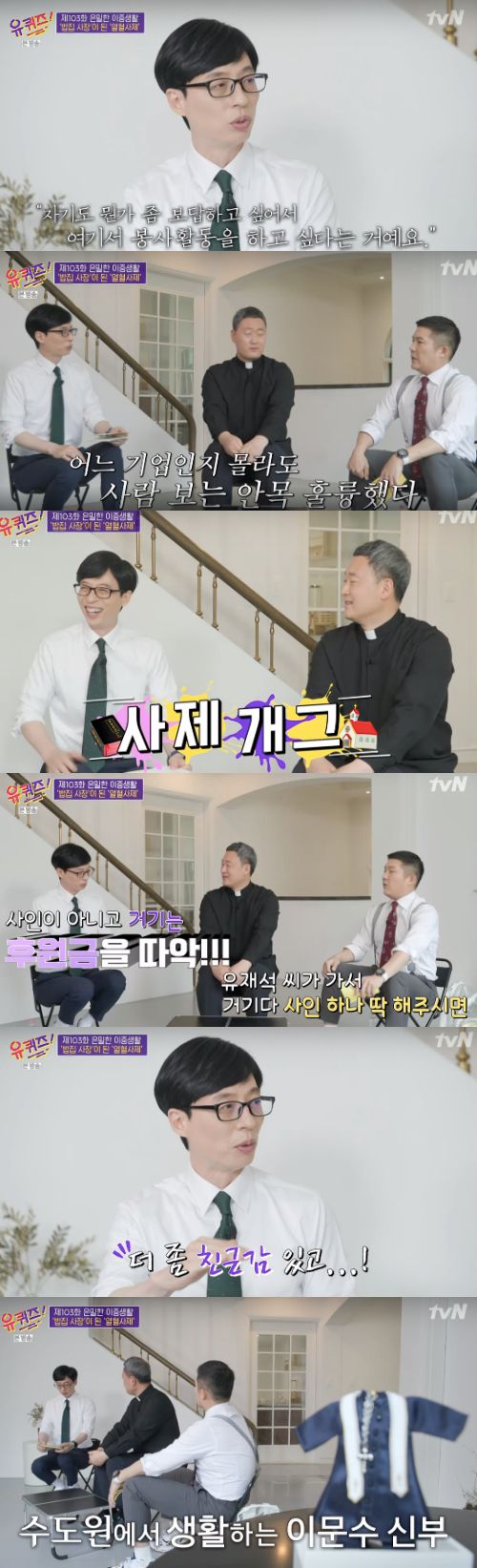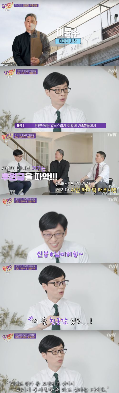 이날 ‘은밀한 이중생활’ 편이 그려진 가운데, 밥집 사장 겸 신부님인 이문수 신부를 만나봤다. 유재석은 “신부님 모시긴 처음”이라며 남다른 감회를 전했다.