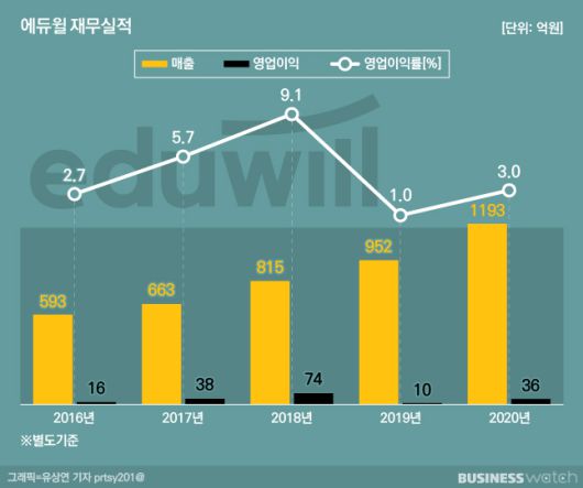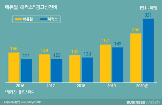 에듀윌 또한 광고비가 수익성에 적잖은 부담으로 작용했다. 매출의 21.4%인 255억원을 쏟아부었다. 전년 보다 58억원 증가한 수치다. 수익성이 가장 좋았던 2018년에 비해서는 110억원 넘게 불어난 액수다.