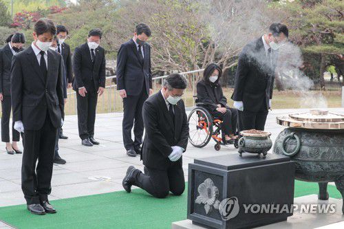 윤 위원장은 이날 원내지도부와 현충탑에 분향한 뒤 무릎을 꿇고 약 1분간 고개를 숙였다.