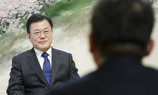 문재인 대통령이 지난 19일 청와대 상춘재에서 뉴욕타임스와 인터뷰하고 있다. 청와대 제공 |
