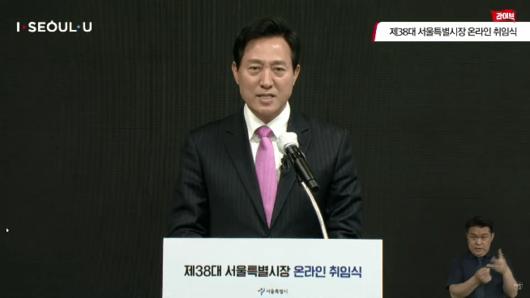 오 시장은 이날 취임사에서 ▲코로나19 방역 유지 및 서민경제 지원 ▲공정과 상생으로 2030 청년세대에게 희망을 ▲신속하지만 신중한 주택정책 마련 ▲1인가구가 행복한 서울 ▲삶의 질과 도시경쟁력 높이는 비전 마련 등 5가지의 시정 약속을 했다.