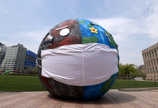 서울시와 녹색서울시민위원회 주최로 22일 오전 서울 중구 시청 앞 광장에서 열린 '2021 지구의 날 기념식'에서 코로나19, 환경오염 등으로 아픈 지구의 모습을 형상화 한 모형이 세워져 있다. 연합뉴스 |