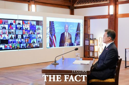 [더팩트ㅣ허주열 기자] 문재인 대통령이 조 바이든 미국 대통령의 초청으로 22일 오후 9시(한국시간)에 화상으로 개최된 '기후정상회의' 1세션에 참여해 전 세계 2050 탄소중립 실현을 위한 우리나라의 강화된 기후대응 행동을 약속했다. '2030 국가 온실가스 감축 목표(NDC)'를 추가 상향해 올해 안에 유엔에 제출하고, 국내외 재생에너지 설비 등에 투자하도록 하는 '녹색금융' 확대를 적극 추진하겠다고 전 세계에 공언했다.
