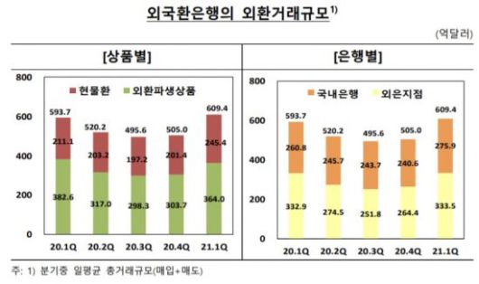 상품별로 보면 현물환 거래(245억4000만달러)가 직전 분기보다 21.8%(44억달러) 늘어났으며, 외환파생상품 거래(364억달러)가 19.9%(60억4000만달러) 불었다.