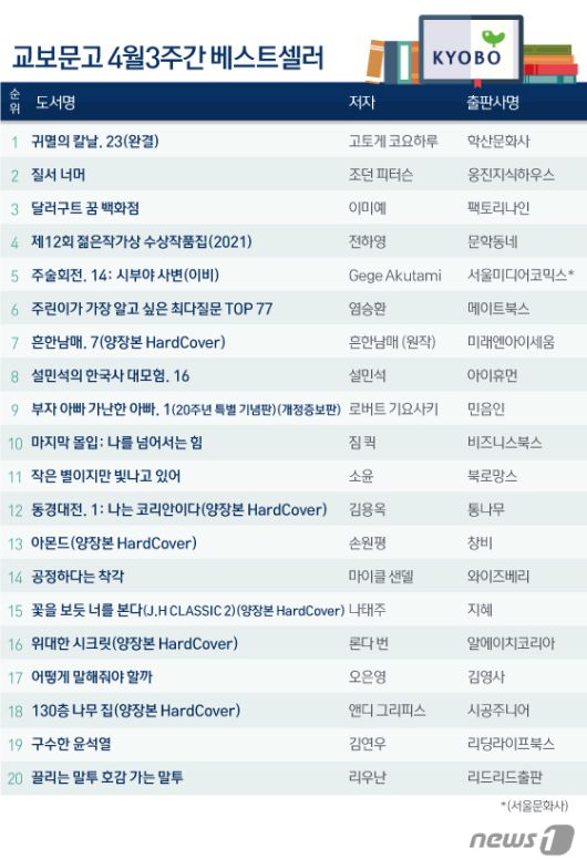 23일 교보문고가 발표한 4월3주간 베스트셀러 집계 순위에 따르면 3주 연속 1위를 차지했던 조던 피터슨 전 하버드대 심리학 교수의 '질서 너머'가 2위로 밀려나고 '귀멸의 칼날'이 1위를 차지했다.