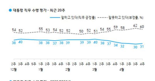 한국갤럽이 지난 20일~22일 1003명을 대상으로 문 대통령의 직무 수행 평가를 조사한 결과, 긍정평가는 31%, 부정평가는 60%를 기록했다. 10%는 ‘유보’ 의견을 보였다.