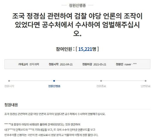 [이데일리 박지혜 기자] 지난 21일 청와대 홈페이지 국민청원 게시판에 ‘조국·정경심 관련하여 검찰, 야당, 언론의 조작이 있었다면 공수처(고위공직자범죄수사처)에서 수사해 엄벌해주십시오’라는 제목의 청원이 올라왔다.