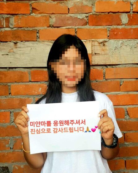 함께 게시한 두 장의 사진 속에는 20대 초반으로 보이는 여성이 에이포(A4) 용지에 인쇄한 손팻말을 든 채 환하게 웃고 있다. 종이에는 한글로 ‘미얀마에 대해 관심을 가져주시고 민주화 운동에(을) 지지해주셔서 대단히 감사드립니다’ ‘미얀마를 웅(응)원해주셔서 진심으로 감사드립니다’라고 적혀 있다.
