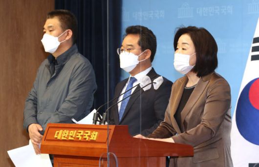 심상정 정의당 의원, 민병덕 더불어민주당 의원, 최승재 국민의힘 의원이 25일 국회 소통관에서 손실보상 소급적용을 위한 3당 의원 공동기자회견을 하고 있다. 사진=뉴시스 |