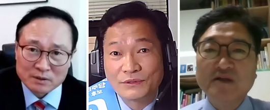 더불어민주당 홍영표, 송영길, 우원식 당대표 후보(왼쪽부터, 기호순)가 25일 더불어민주당 민주당 세계한인민주회의 당대표 및 최고위원 후보자 초청 온라인 연설회에서 연설하고 있다. [연합] |