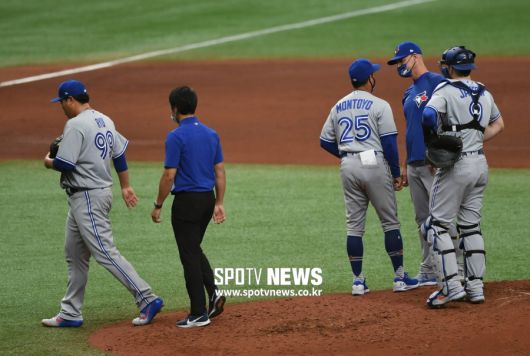 [스포티비뉴스=고유라 기자] 토론토 블루제이스 투수 류현진이 경기 중 먼저 더그아웃에 사인을 보내고 마운드를 내려왔다.