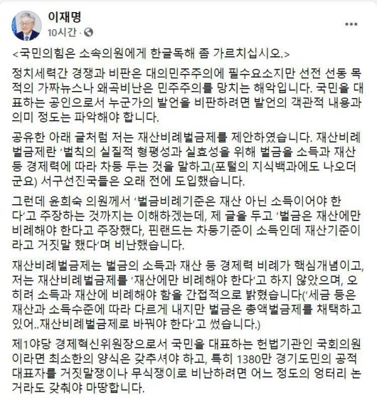 그러자 이 지사는 페이스북을 통해 윤 의원의 글을 재반박하며 “국민의힘은 소속 의원에게 한글 독해를 좀 가르치라”고 했다. 그는 “(내가 제안한) 재산비례벌금제란 ‘벌칙의 실질적 형평성과 실효성을 위해 벌금을 소득과 재산 등 경제력에 따라 차등 두는 것을 말하고, 서구 선진국들은 오래 전에 도입했다”고 했다.