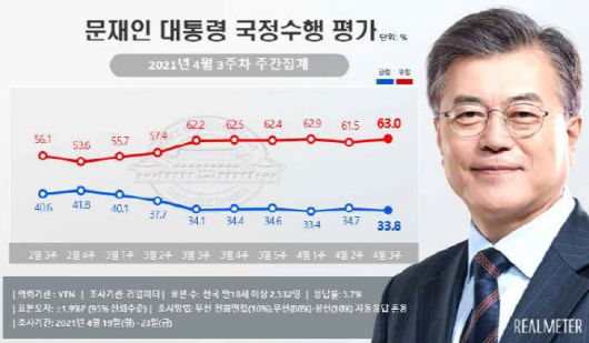 여론조사 전문기관 리얼미터가 YTN 의뢰로 지난 19~23일 전국 18세 이상 유권자 2532명을 대상으로 한 4월 3주차 주간집계를 보면, 문 대통령에 대한 긍정평가는 전주 대비 0.9%포인트 하락한 33.8%였다.