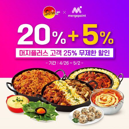 머지포인트 앱 설치 후 머지플러스 서비스를 구독하면 누구나 혜택을 받을 수 있으며, TOSS(토스), PAYCO(페이코) 등의 결제 수단이나 카드 등록 뒤 생성된 바코드를 통해 결제하면 할인이 적용된다. 유가네에서 판매중인 닭갈비와 볶음밥 외에도 계란찜, 주먹밥, 어묵탕 등 전 메뉴에 할인 적용이 가능하다. 프로모션 기간 중 머지플러스 신규 등록 시, 30일간 무료 체험 혜택을 제공한다.