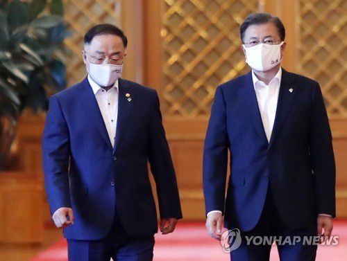 지난해 6월 1일 청와대에서 열린 제6차 비상경제회의에 참석하는 문재인 대통령과 홍남기 국무총리 직무대행. [연합뉴스 자료사진] |