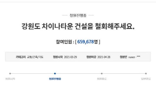청원인은 “중국의 동북공정에 우리 문화를 잃게 될까 봐 불안감을 느끼고 있는 상황에서 도내 차이나타운의 건설을 강력하게 반대한다”고 밝혔다. 해당 청원은 공식 답변 기준을 넘은, 66만 명 이상의 동의를 얻은 상태다.