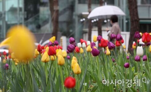 봄비가 내린 지난 12일 서울 중구 무교동에서 우산을 쓴 시민들이 튤립 앞을 지나고 있다./김현민 기자 kimhyun81@ |