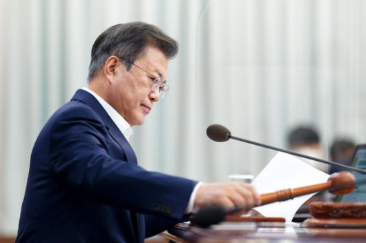 문재인 대통령이 27일 청와대 여민관에서 열린 제18회 국무회의에서 의사봉을 내려놓고 있다. 뉴스1 |