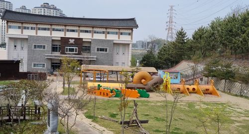 1억5천만원이 투입된 이 놀이터는 320㎡ 규모로, 기지시줄다리기 큰 줄과 용, 줄 틀 등을 상징하는 조형물과 어린이 놀이시설을 갖췄다.