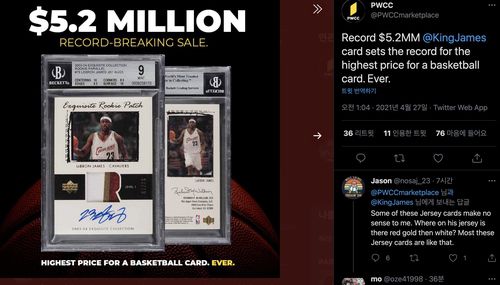 이번에 타이기록을 쓴 제임스의 카드는 24일까지만 해도 172만 달러(약 19억1천만원)에 거래됐는데 불과 며칠 만에 가격이 200%나 상승했다.
