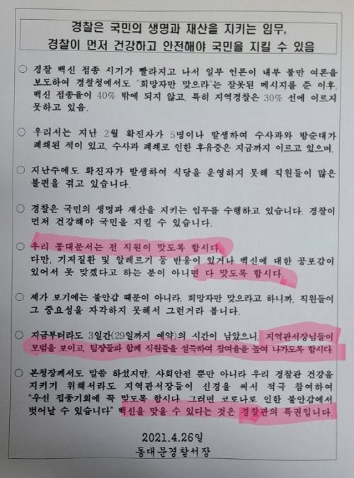 서울 동대문경찰서 소속 경찰관으로 추정되는 작성자는 “위에서 ‘소방의 백신 접종률은 90%가 넘는데 경찰은 40% 수준’이라며 하루빨리 맞으라는 카카오톡 메시지를 보냈다”며 경찰서장이 내려보낸 공문으로 보이는 사진을 공개했다.