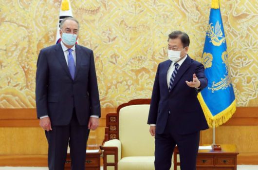문 대통령은 이날 오후 청와대 본관에서 스탠리 어크 CEO 등 노바백스 관계자를 비롯해 최창원 SK디스커버리 부회장과 안재용 SK바이오사이언스 사장을 접견하고 "아주 우수한 기술력으로 훌륭한 백신을 신속하게 개발해서 인류의 코로나 바이러스 퇴치에 기여할 수 있게 된 노바백스사에 축하와 감사를 드린다"며 이같이 말했다.