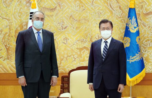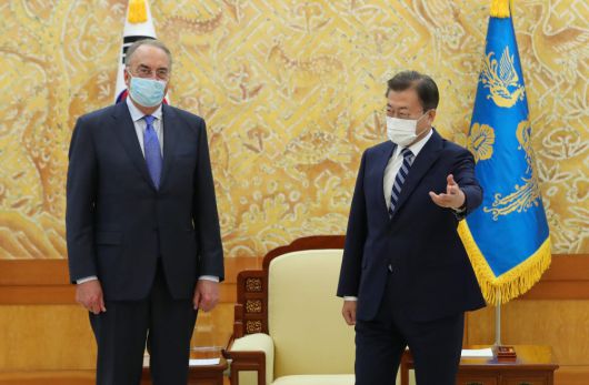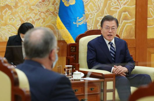 문재인 대통령이 27일 청와대 본관에서 스탠리 에르크 노바백스 최고경영자(CEO)를 접견하고 있다. 문 대통령은 노바백스와 SK바이오사이언스의 기술 이전을 통한 위탁생산 계약 체결을 언급한 뒤 “한국에서 생산이 이뤄지고 있어 우리에겐 의미가 매우 크다”면서 “우리 정부는 양사의 협력 관계가 앞으로도 유지되고 더욱더 발전돼 나가길 바란다”고 말했다.